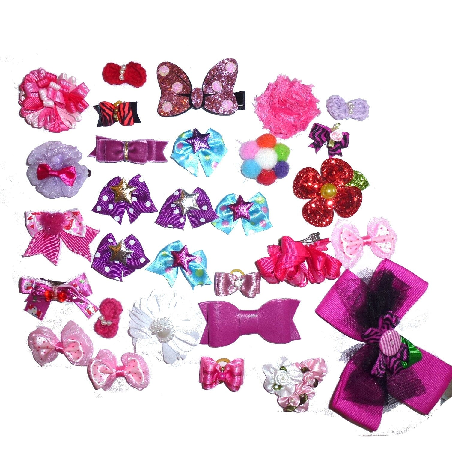 Total of 30 bows as shown in photo with latex band. A few have a barrette. They measure 1"-2" wide. All of my hair barrettes can be used for pets with long hair, babies, toddlers, girls, women or for wedding accessories. I have been making barrettes and hair bows for over 20 years. Check my store for more dog bows, pet hair bows, dog bow accessories, dog tiaras, rhinestone barrettes for dogs, DIY hair bow making accessories, tiny snap clips for dogs and much much more.
