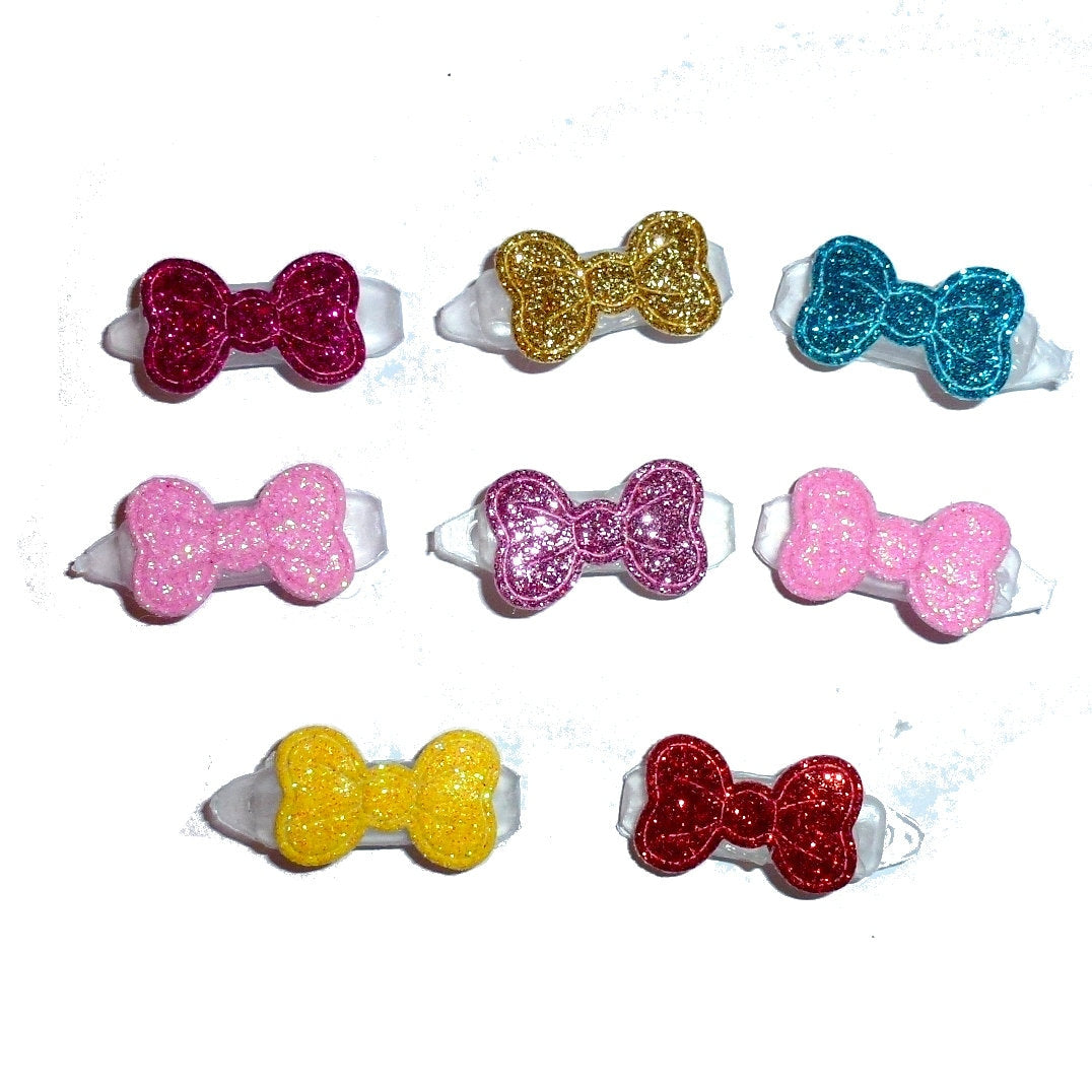 Each little bow is attached to a 3/4" plastic barrette clip. You get 8 little clips per order. Color assortment will vary just a little per order as I have less of the blue and gold than the other colors.All of my hair bows can be used for pets with long hair, girls, women or for wedding accessories. I have been making barrettes and hair bows for over 20 years. Please check my store for more beautiful, stylish dog hair accessoriesCheck my store for more dog bows, pet hair bows, dog bow accessories, dog tiaras, rhinestone barrettes for dogs, DIY hair bow making accessories, scarf bows for women, oversized bows for ladies, hair bows for girls, tiny snap clips for dogs, craft items and much much more.