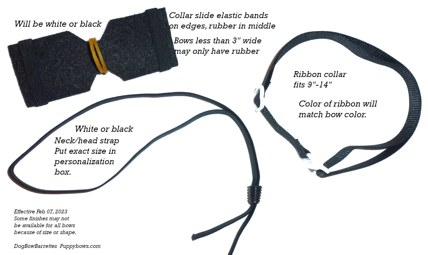 You will only receive 1 bow no matter how many are shown in the photos. The size of the bow will not change no matter what attachment/finish you choose.Depending on the attachment/finish you choose, the item may arrive facing a different direction or in a different position than what is shown in the photos. Snap clips, alligator clips and french barrettes are only covered if the clip is larger than the item.You should always make a topknot before attaching the bow no matter what attachment/finish you choose.Bows are handmade, and there may be small or slight differences even when I make the same bow or different from the photo. Ribbon collars are decorative only and should never be used for restraint.If you need your items for a special event or date, you should email me before ordering to determine my current shipping schedule.Before emailing me about the status of your shipment, please check your order email for the "expected delivery date" NOT the shipment date, and add 5 days to that for unexpected postal delays.