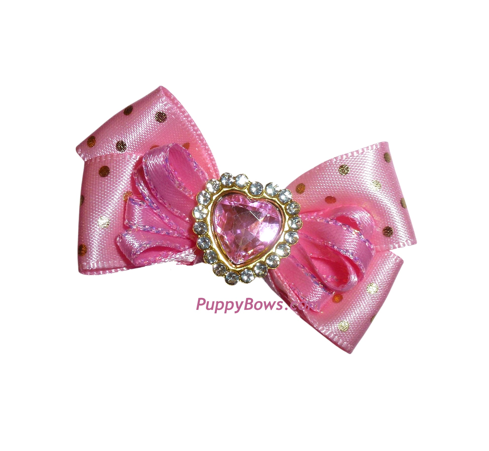Puppy Bows ~ dog hair grooming bow pink gold dots rhinestone heart pet bows