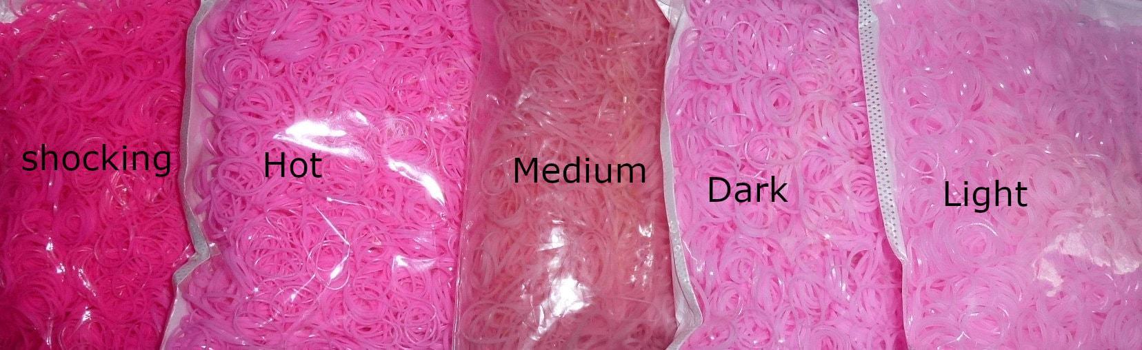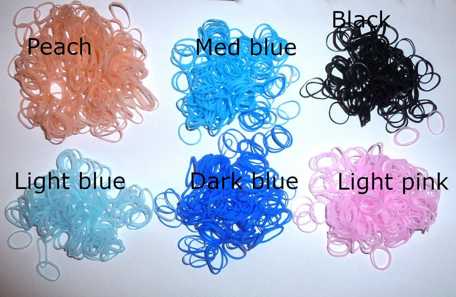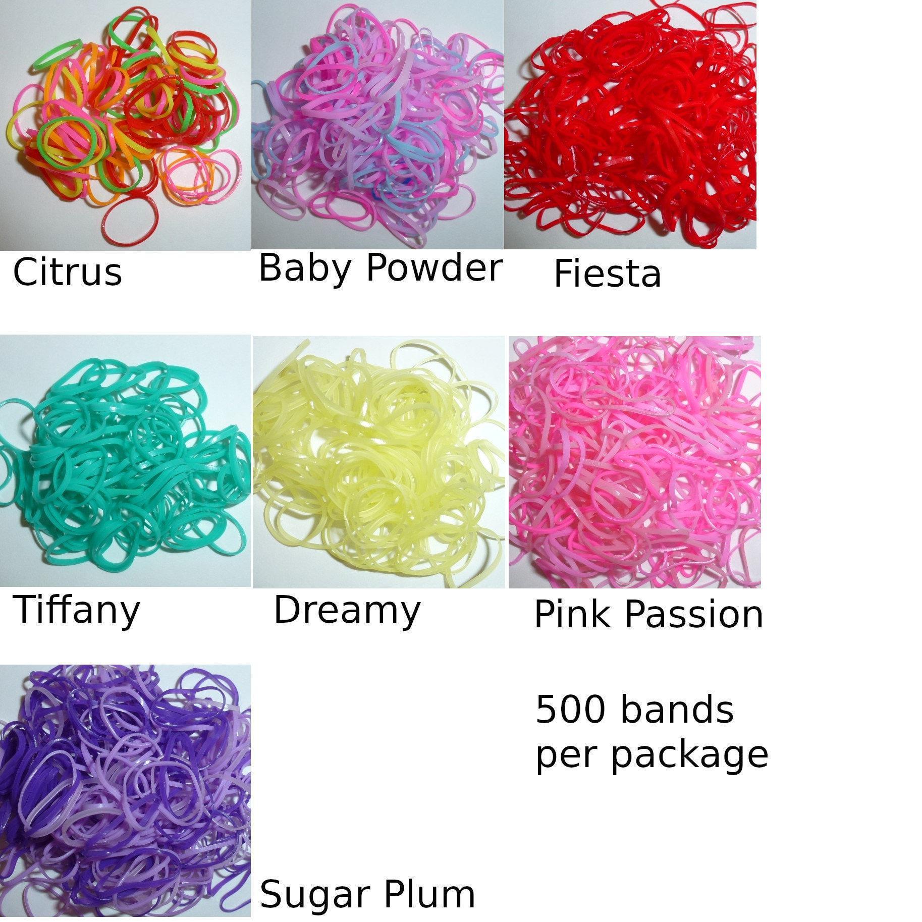 These are non latex lightweight 3/8" bands in candy colors. Each bag contains about 500 or 1000 bands.