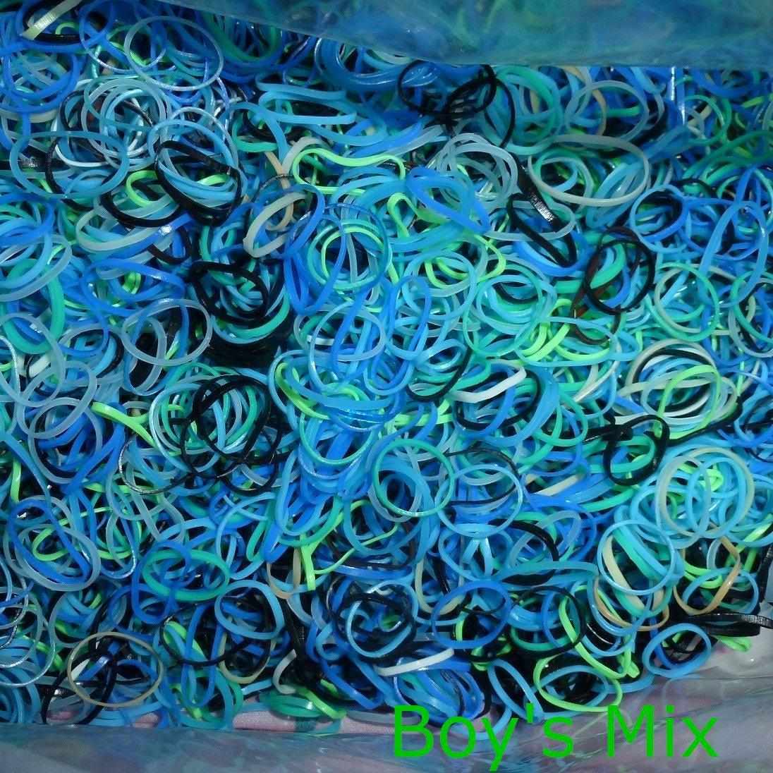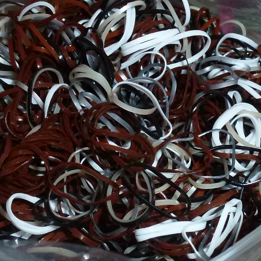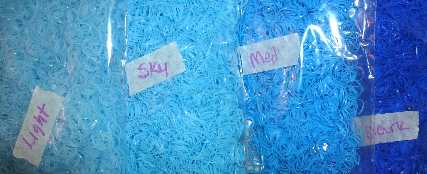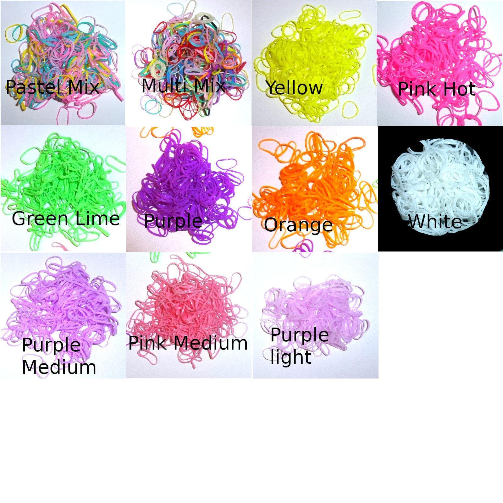 These are non latex lightweight 3/8" bands in candy colors. Each bag contains about 500 or 1000 bands.