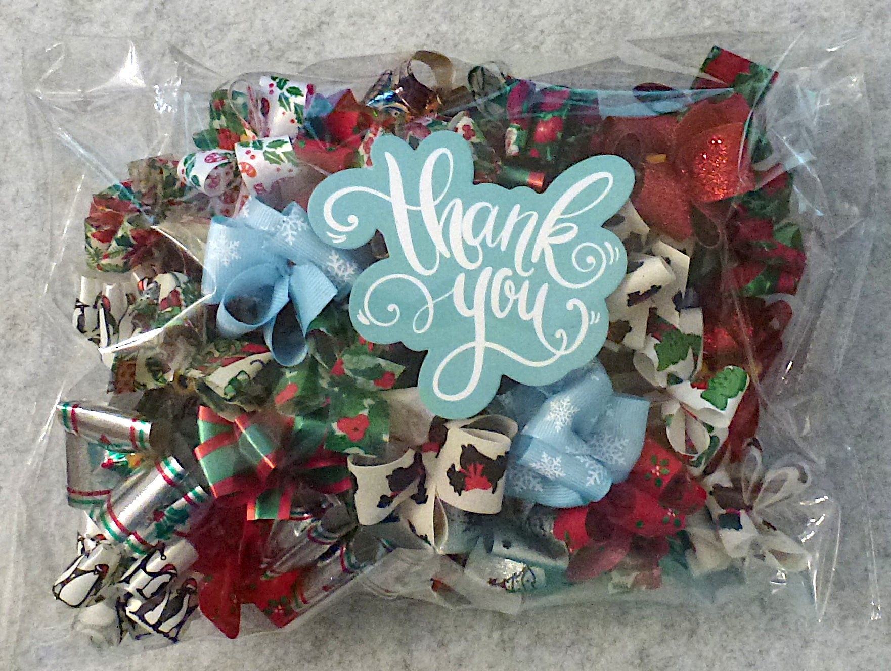Party puffs are multi loop dog bows with a latex band attachment. They look like little package bows. This assortment is created with craft ribbon in Christmas patterns & colors, has at least 8 loops each. They measure slightly smaller than 2".