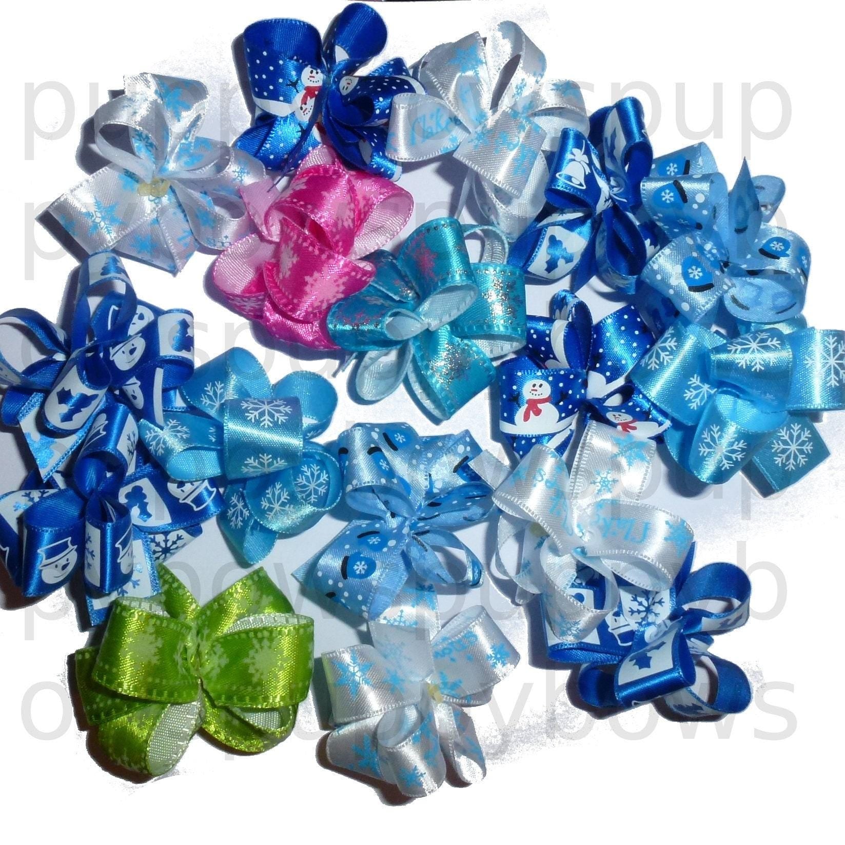 Puppy bows ~ winter snow bows blue snowflakes snowmen dog grooming hair bow
