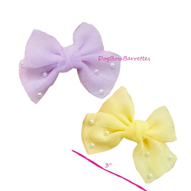 Puppy Bows ~ Purple or yellow chiffon and pearls dog pet hair bow bands or barrette (FB610)