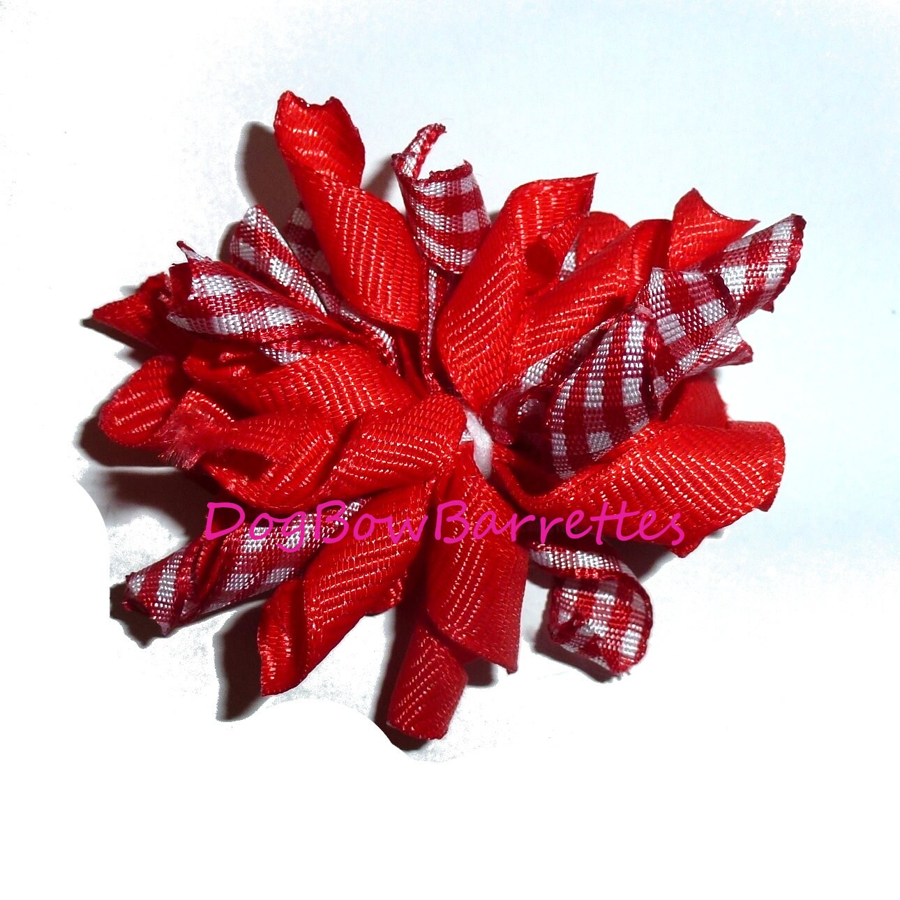 Puppy Bows red/white check tiny Korker loop dog bow pet hair clip barrette or latex bands corky curly corker (fb556)
