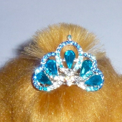 This amazing blue water drop tiara measures 1.5" x 1" and had a french barrette closure. 5 pear shaped rhinestones are surrounded by a combination of blue and crystal tiny rhinestones. I've been making bows for 20+ years Custom order available. PuppyBows . com has 100's of pre-made dog bows ready to ship now.Mark 8:36 "For what does it profit a man to gain the whole world if he loses his own soul?" Check my store for more dog bows, pet hair bows, dog bow accessories, dog tiaras, rhinestone barrettes for dogs, DIY hair bow making accessories, scarf bows for women, oversized bows for ladies, hair bows for girls, tiny snap clips for dogs, craft items and much much more.